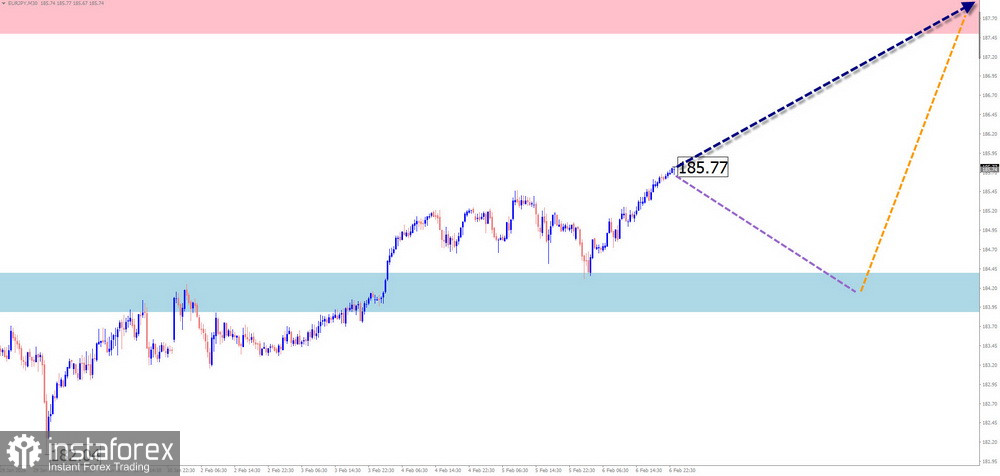 Achat : Autorisé avec une taille de position réduite au sein des sessions individuelles. Le potentiel est limité par la résistance. Vente : Deviendra pertinente après l’apparition de signaux de retournement confirmés à proximité de la résistance calculée.